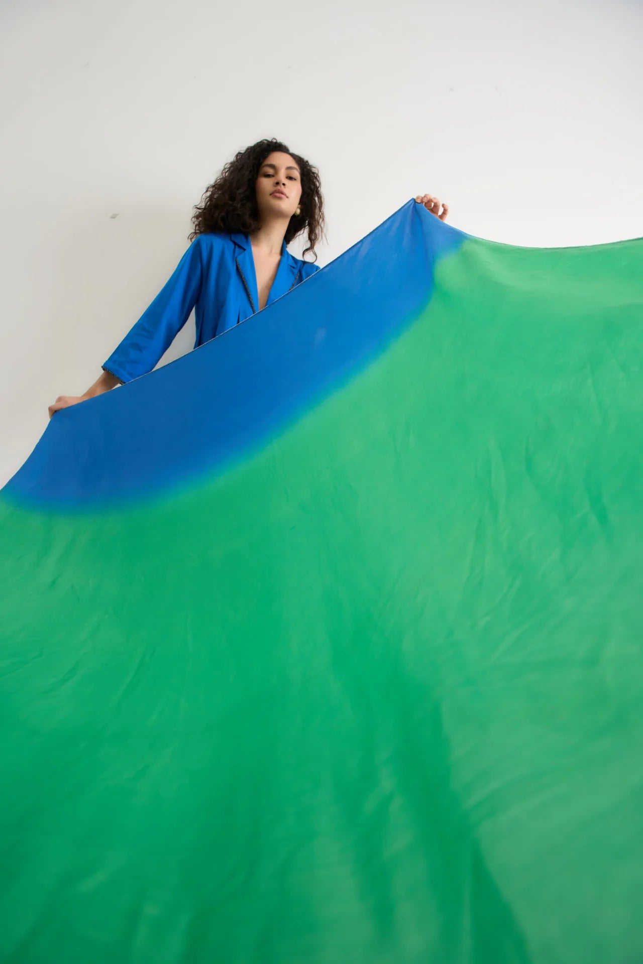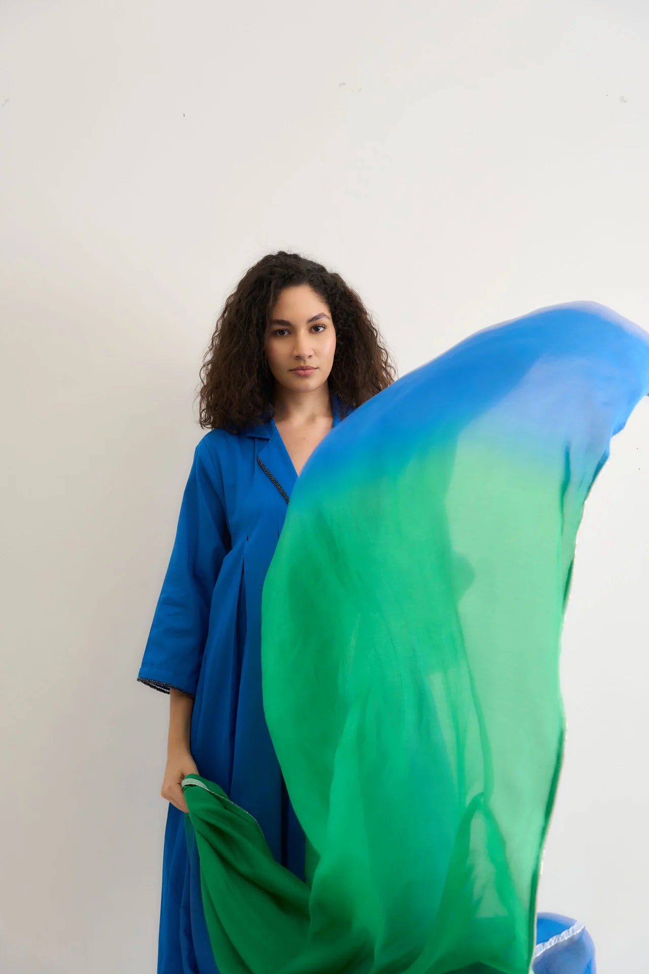 The cotton silk full size dupatta is dip dyed in ombre colour with cut dana lace detailing.