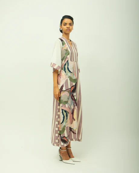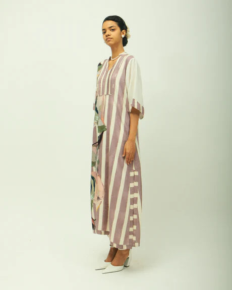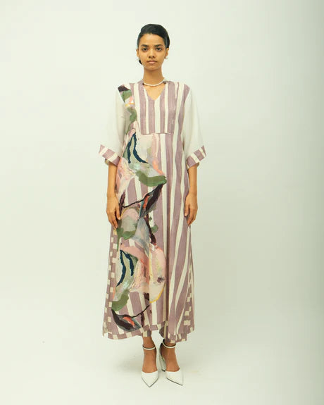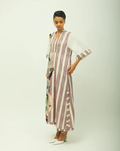 Anti fit, shirt collar, square yoke, top stitch detailing, voluminous full sleeves, gathers on sleeves and bust line, side slit, relaxed fit. Variations in color, texture, and weave are inherent due to the hand-made nature of the garment- Single piece. Garment Length - 48"