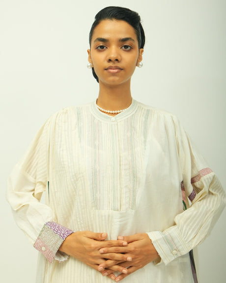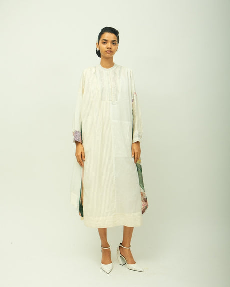 Anti-fit dress featuring a mandarin collar and pintuck detailing along the yoke. Designed with subtle gathers at the shoulders, a half front placket, and full-length sleeves. The cuffs and sleeves are accentuated with delicate beadwork and hand embroidery. Crafted in a lightweight fabric, this piece offers ease and elegance. Print placement may vary—each garment is one of a kind. Garment Length - 48"