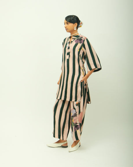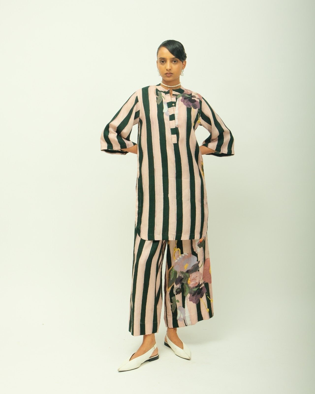 Anti-fit silhouette featuring a mandarin collar, half placket, and three-fourth sleeves. Adorned with a digitally transferred hand-painted abstract expressionist print, and finished with functional side pockets. This piece offers a blend of comfort and understated elegance. Structure and print placement may vary—each garment is one of a kind. garment Length - 36"