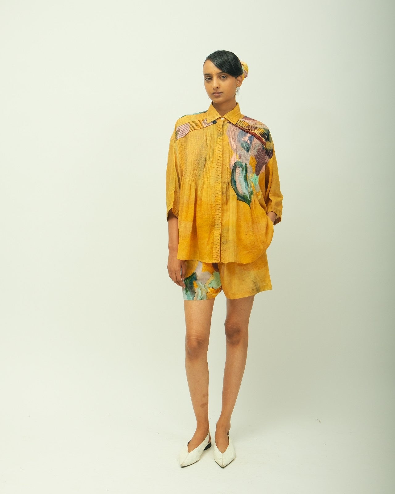 High-waisted ochre shorts with a relaxed fit with drawstring, featuring digitally developed prints derived from original hand-painted artworks. The floral placement may vary. Garment Length - 16"