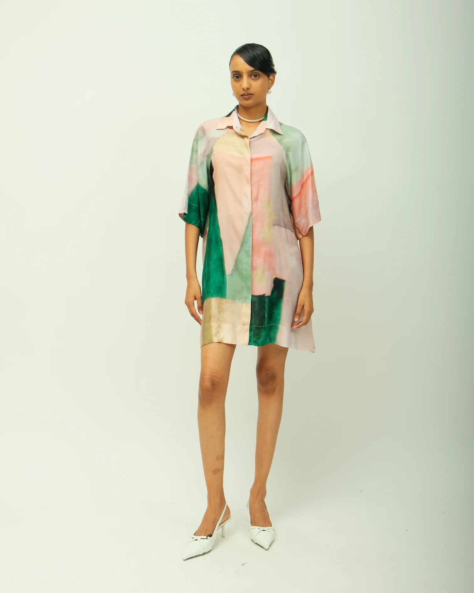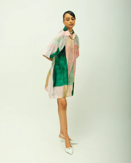 A breezy shirt dress featuring abstract, hand-painted brushstrokes in soft shades of green, blush, and coral. Tailored in a lightweight fabric with a relaxed silhouette, this piece brings together casual ease and artistic expression — ideal for effortless, everyday styling with a statement edge. Garment Length - 34"