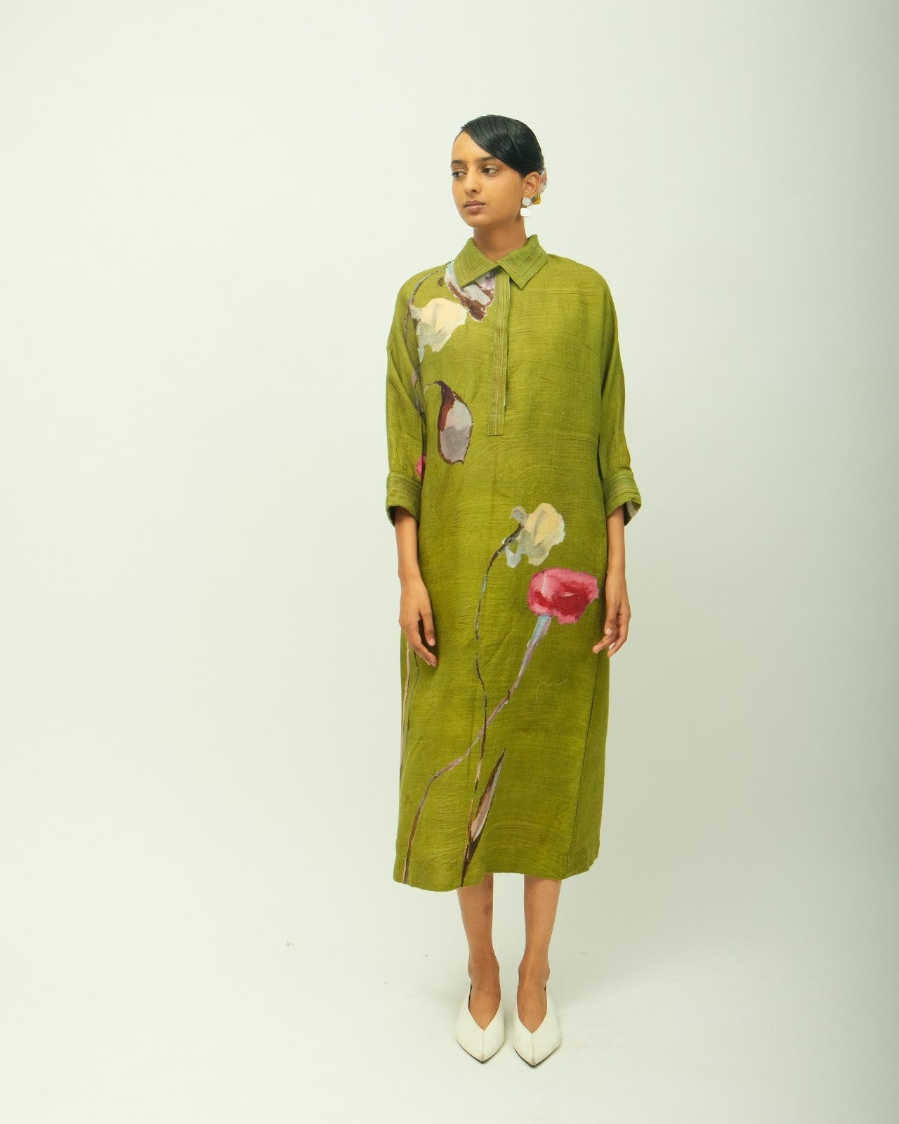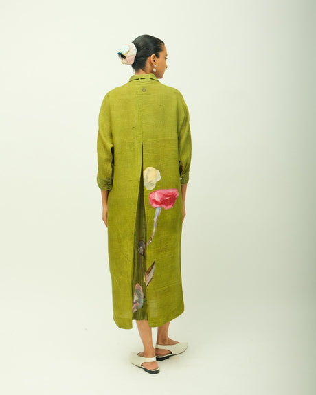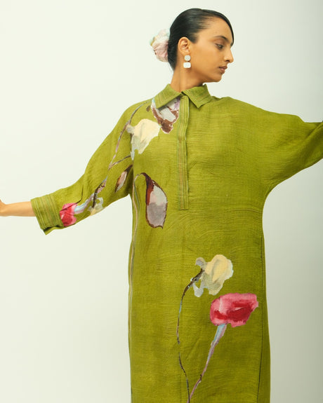 Anti-fit dress featuring a classic shirt collar and full-length sleeves. Accented with vertical pintucks along the half placket and fine topstitch detailing on the cuffs. Designed with functional side pockets and adorned in a hand-painted abstract expressionist print, digitally transferred for precision and vibrancy. Print placement may vary—each piece is uniquely crafted. Garment Lemgth - 48"