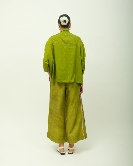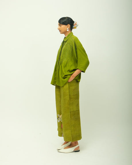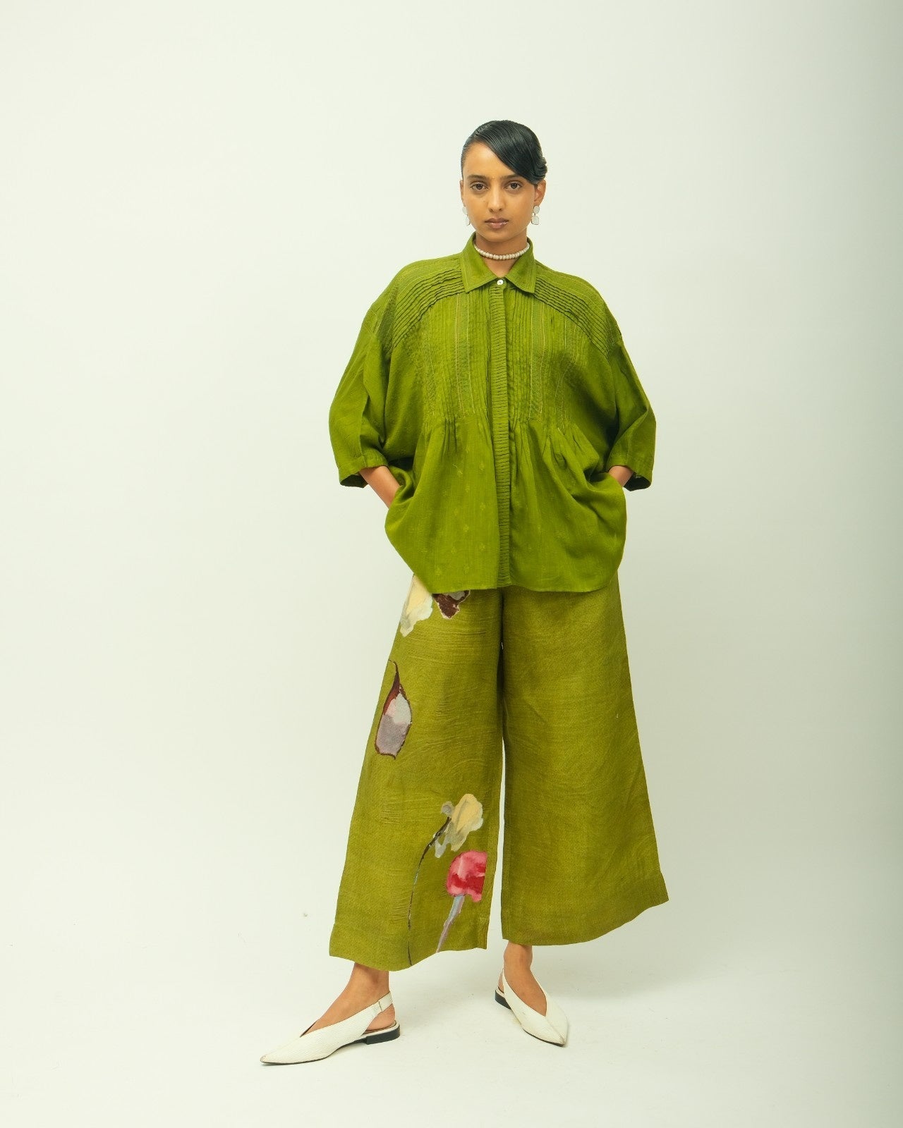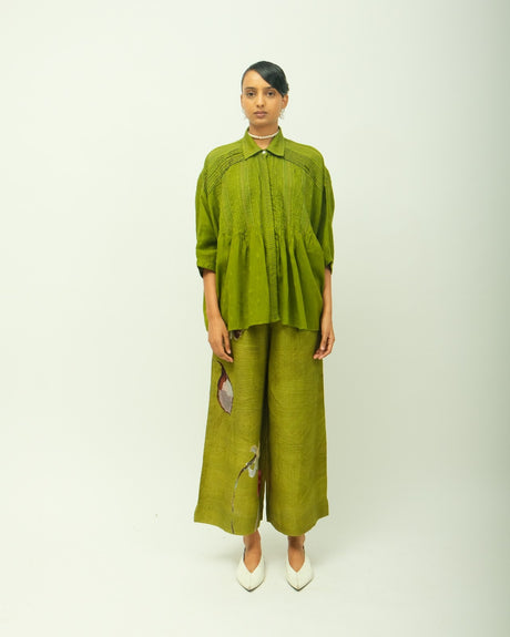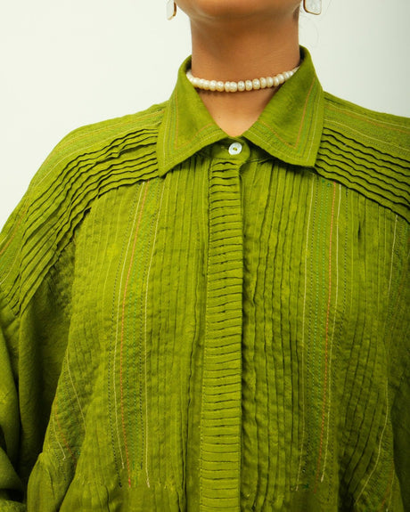 Anti fit, short sleeved top, relaxed fit, vertical pin tucks on front, crafted from lightweight textiles. this piece offers both comfort and understated elegance. Variations in color, texture, and weave are inherent due to the hand-made nature of the garment- Single piece. Garment Length - 27"