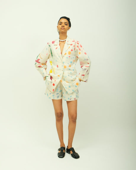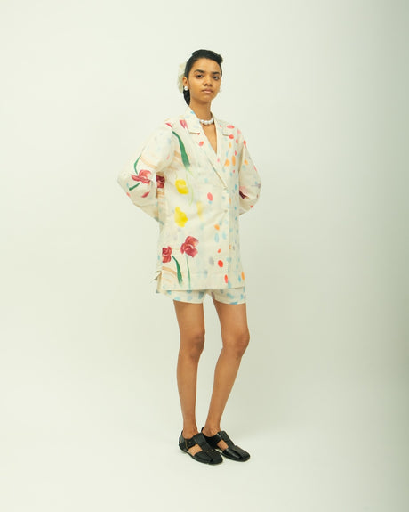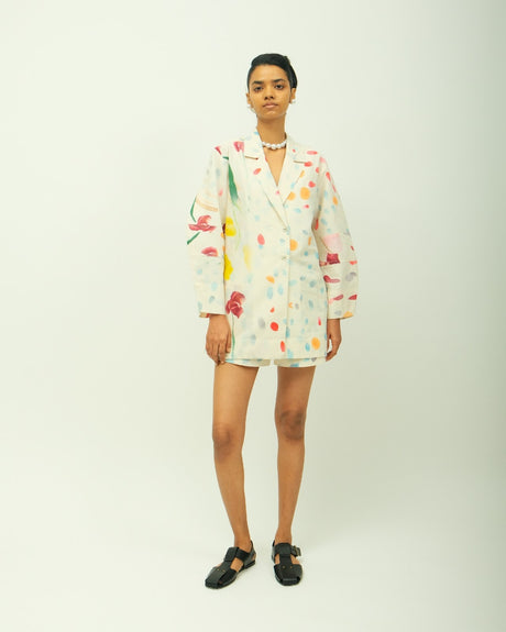 Anti-fit silhouette featuring a V-neckline with a notched lapel collar. The garment showcases a hand-painted abstract expressionist print, digitally transferred for precision and vibrancy. Sleeves are highlighted with intricate appliqué detailing. each piece is uniquely crafted. Garment Length - 30"