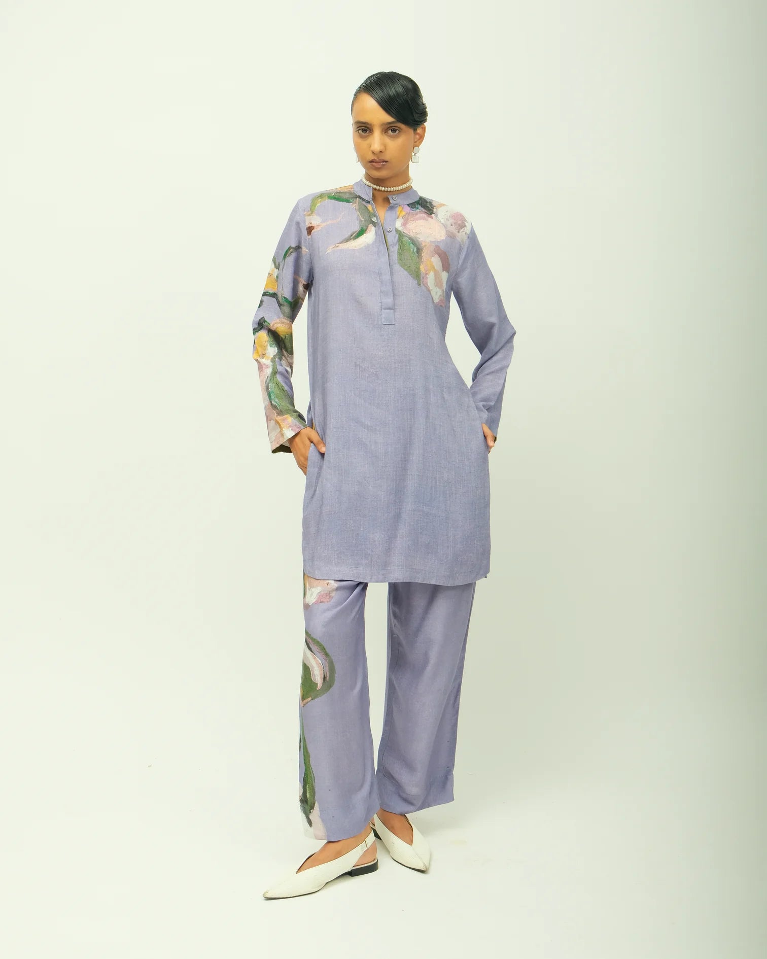 Anti fit, drawstring straight pants, front belt, back elasticated, hand-painted abstract expressionist digitally transferred print, side pockets. Print placement may vary—single Piece. Garment Length - 39"