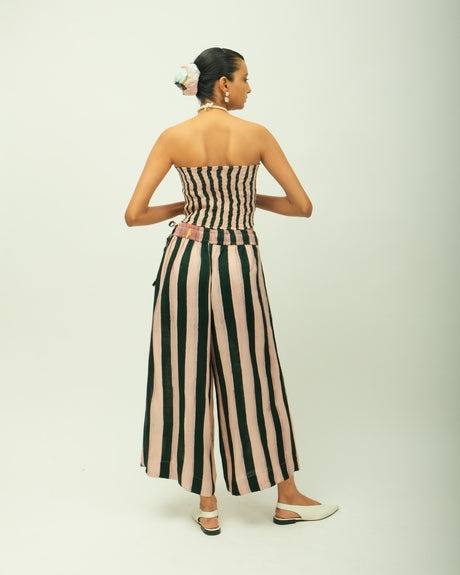 A strapless striped bralette in soft pink and dark green tones, featuring a clean bandeau cut. The back is elasticated for comfort and a secure fit, offering a sleek and structured silhouette. Garment Length - 8"