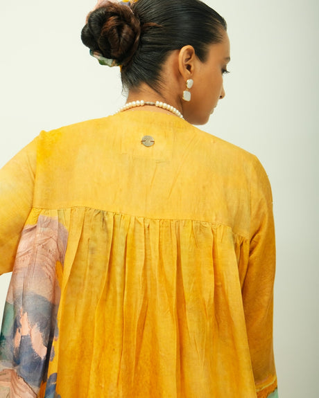 Anti fit, full sleeved dress, relaxed fit, empire line silhouette with the gathering around the waist , hand-painted abstract expressionist digitally transferred print, crafted from lightweight textiles. this piece offers both comfort and understated elegance. Print may vary- Single piece. Garment Length : front - 47". back - 48"